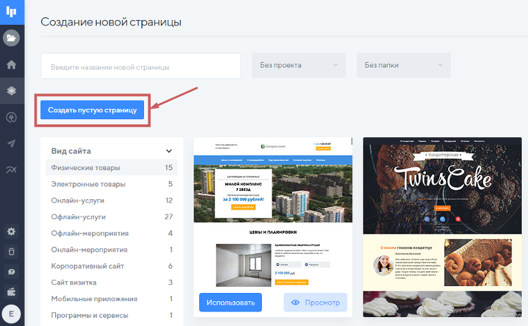 Вместо шаблона можно создать страницу с нуля. При создании она будет полностью пустой и вы сможете самостоятельно наполнить ее секциями и виджетами.