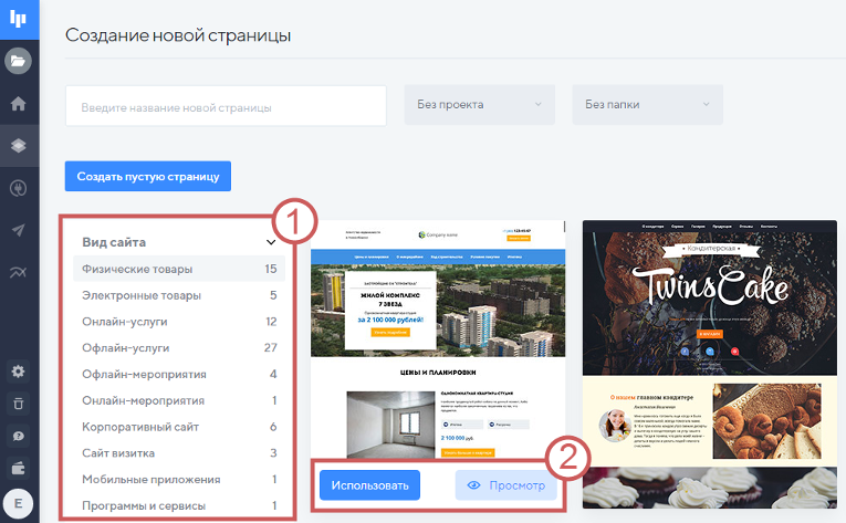 Нажмите на кнопку «Просмотр» , чтобы полностью посмотреть шаблон, или наведите на него курсор и прокрутите колесом мыши. Чтобы создать страницу на этом шаблоне - нажмите на кнопку «Использовать».