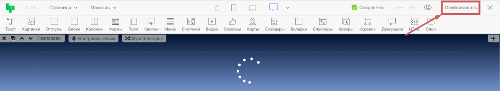 Шаг 4. В правом верхнем углу нажмём «Опубликовать» , и страница станет доступной посетителям.