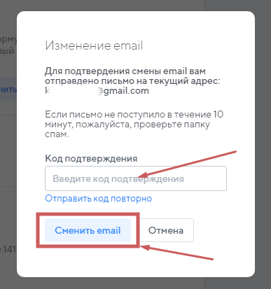 После вставьте данный код в поле всплывающего окна и нажмите кнопку «Сменить email »: