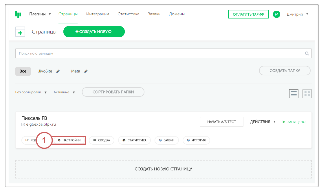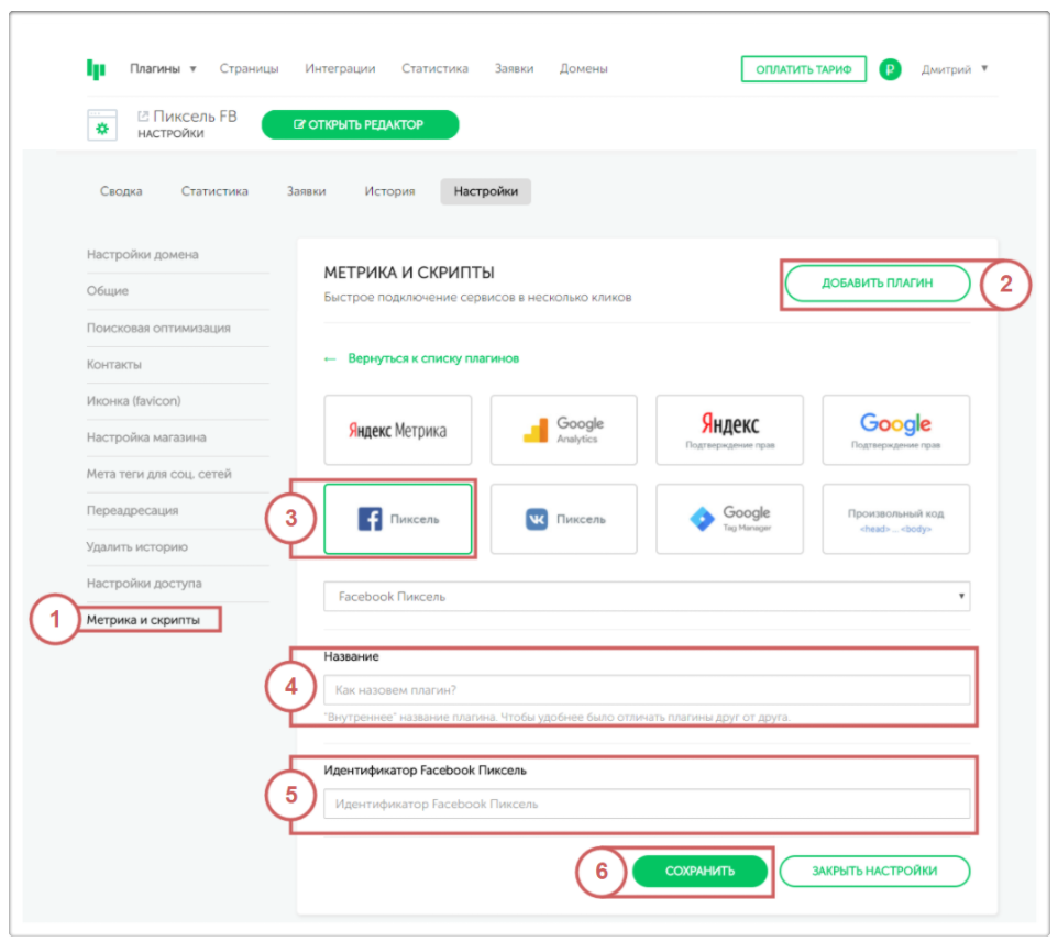 Переходим во вкладку «Метрика и скрипты» и добавляем новый плагин «Пиксель FB» , указываем любое понятное название**** и вставляем скопированный ранее ID (идентификатор Facebook пиксель) изШага 4.