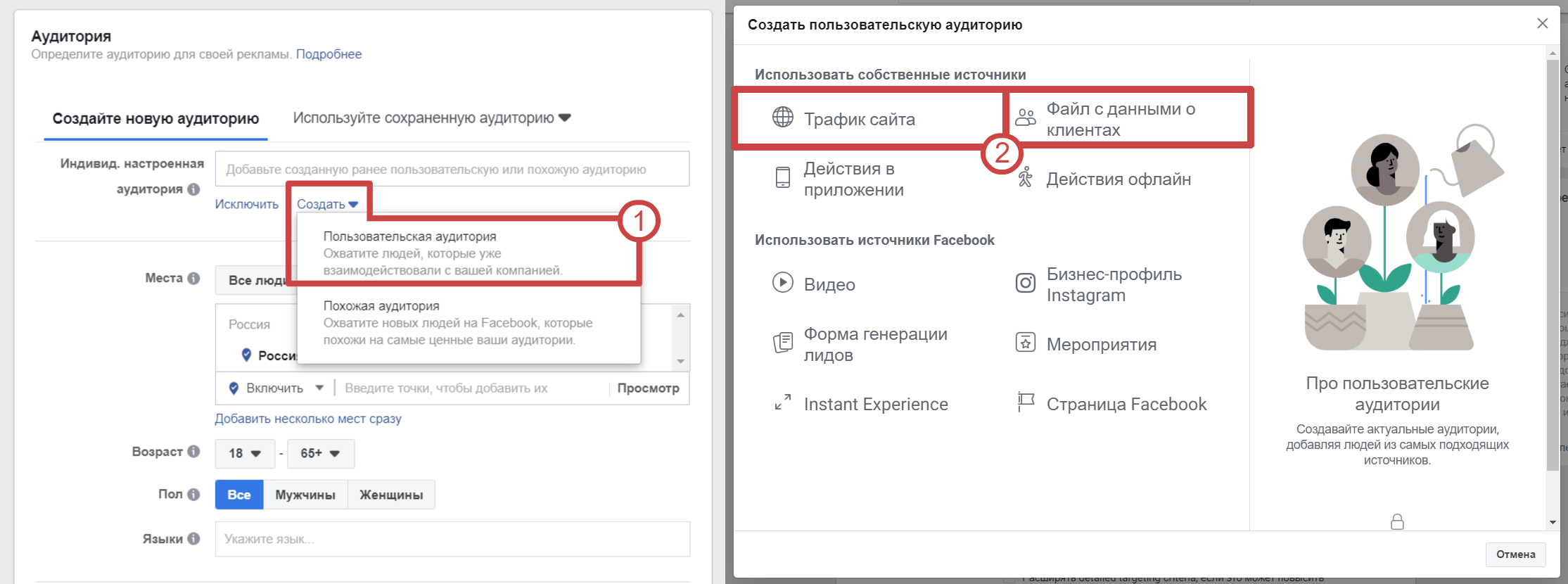 Есть возможность создать индивидуально настроенную аудиторию. Например, загрузить её из файла или выбрать «Трафик сайта», то есть внести в аудиторию людей, ранее посещавших целевую страницу.