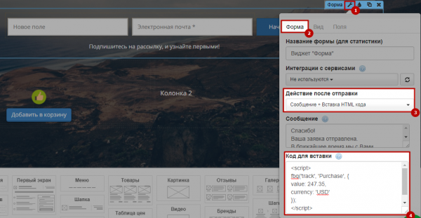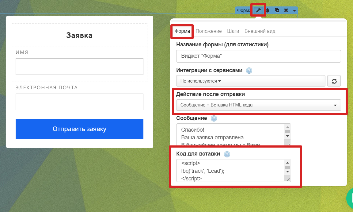 1. Можно указать код в настройках формы, выбрав «Сообщение + Вставка HTML кода» и добавить код в поле «Код для вставки»: