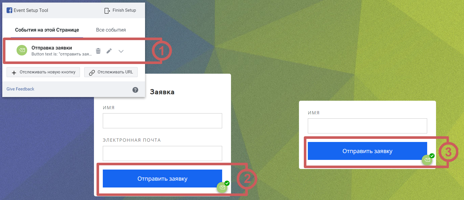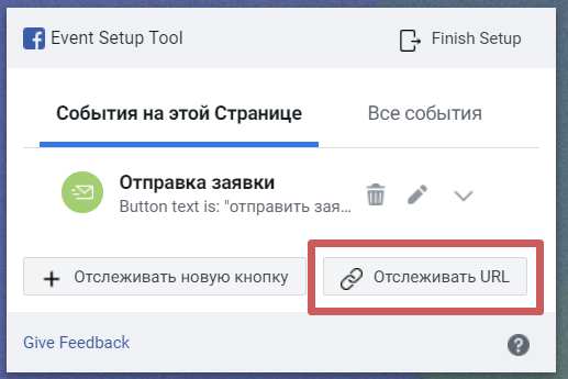 Откроется ваша страница и панель управления событиями. Нажмите на кнопку «Отслеживать новую кнопку»