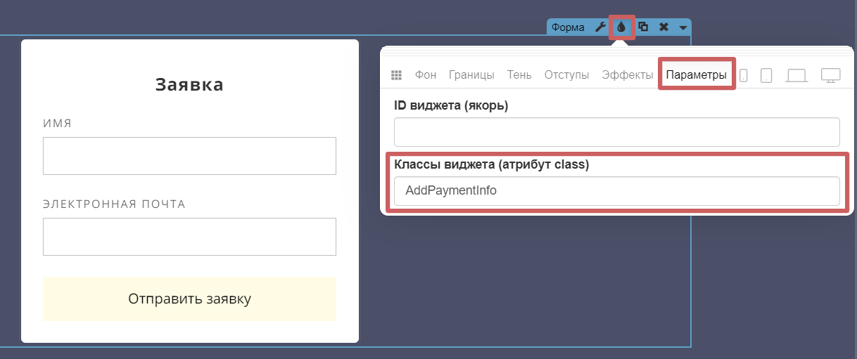 В настройках формы нужно указать класс «AddPaymentInfo»(без кавычек).
