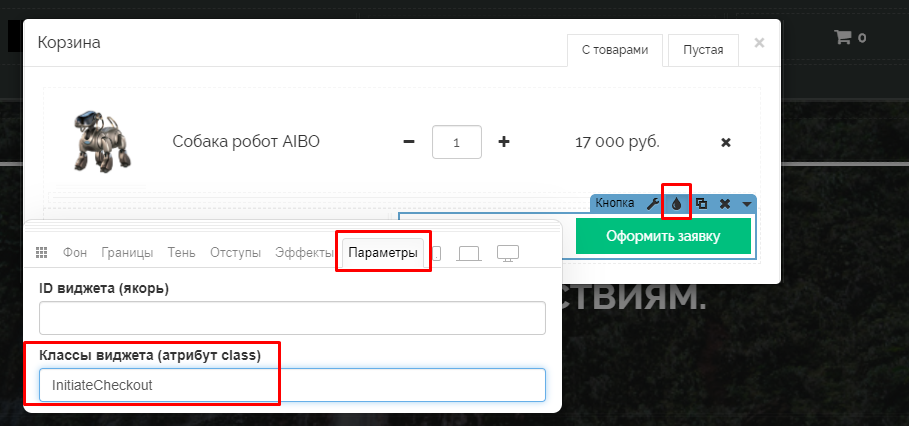 А в настройках кнопки, которая откроет окно с формой нужно указать Класс «InitiateCheckout»