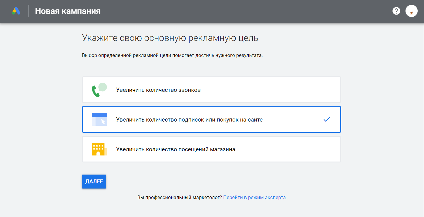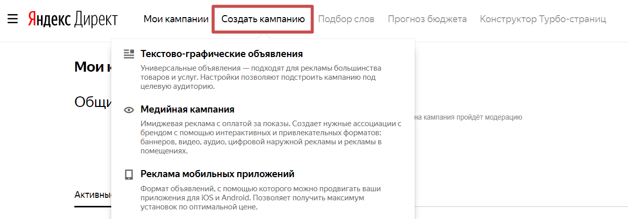 Выберем пункт «Создать кампанию » в верхнем меню. Нужно выбрать тип объявлений и заполнить форму или шаги, в зависимости от выбранного пункта.