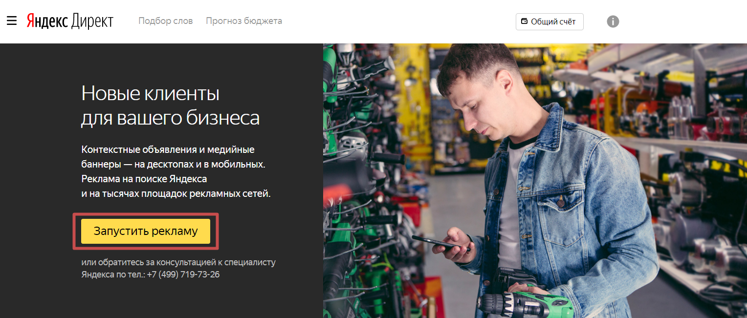 Заходим в Яндекс.Директ и нажимаем кнопку «Запустить рекламу» ;