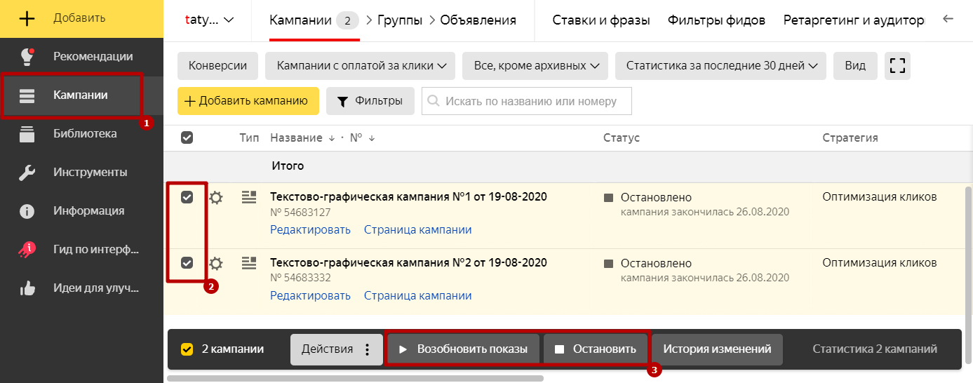Приостановить показ рекламы Яндекс.Директ можно в разделе «Кампании».