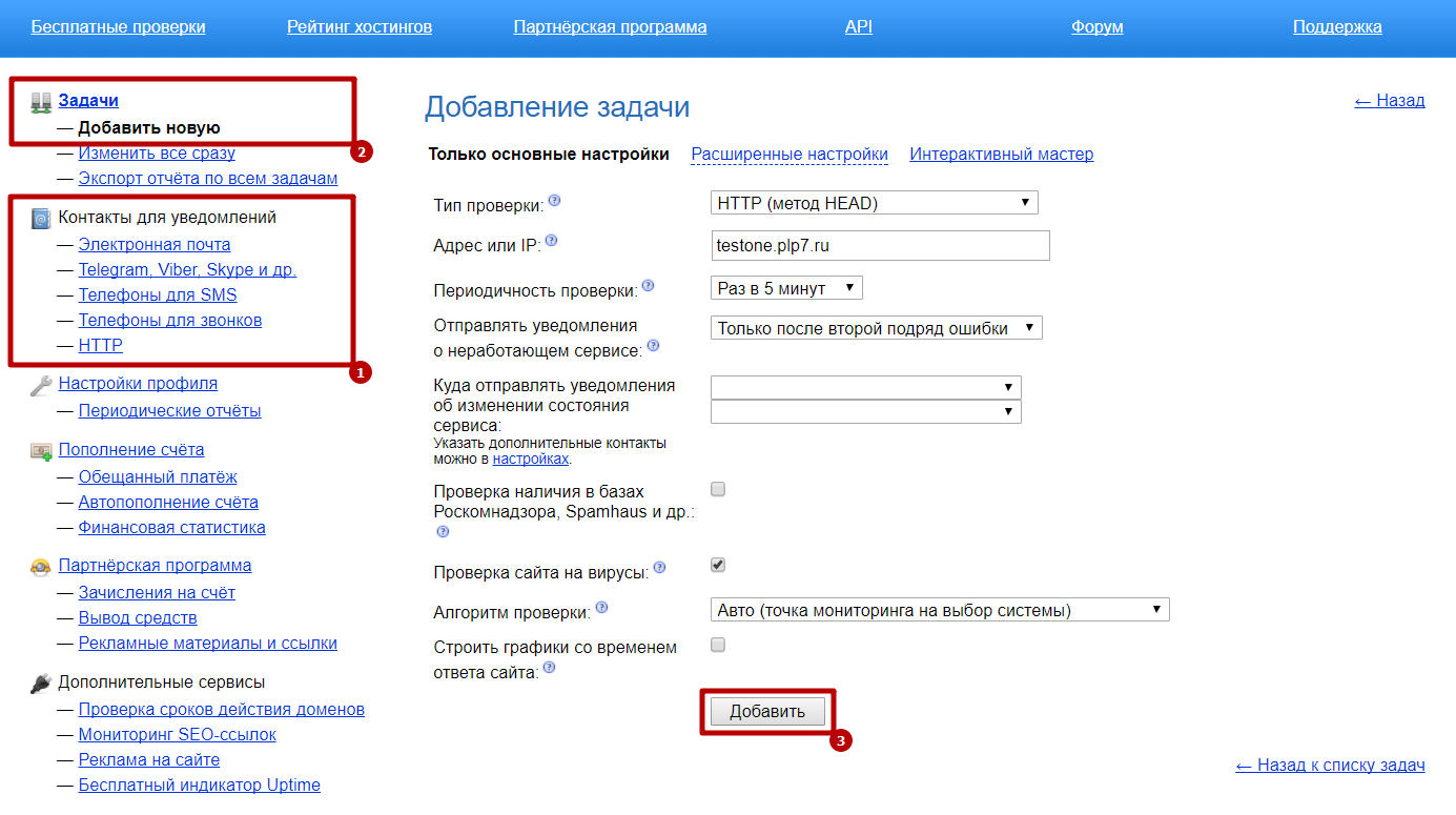 После регистрации на сайте станет доступен автоматический платный мониторинг. В первую очередь рекомендуется добавить контакты для уведомлений. Чтобы начать отслеживать доступность сайта, добавим новую задачу: укажем адрес сайта, периодичность проверки и способ доставки уведомлений.