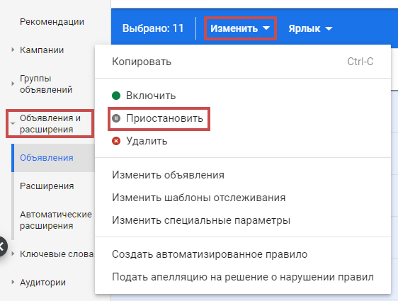 Для остановки показа объявлений в Google Adwords необходимо: