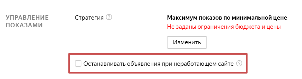 📝Совет: при настройке кампании можно активировать алгоритм «Останавливать объявления при неработающем сайте », который позволит сохранить средства при возникновении неполадок с основным сайтом.
