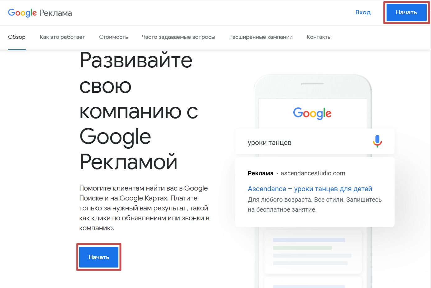 Заходите в Google Adwords и нажимаете кнопку «Начать сейчас».