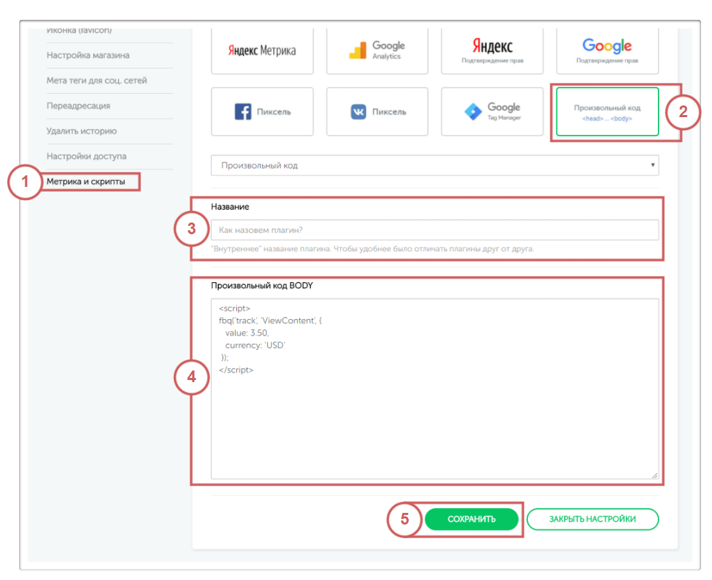 Чтобы зафиксировалось это событие, на страницах https://domain.ru/tovar1 и https://domain.ru/tovar2 во вкладке «Метрика и скрипты» добавляем плагин «Пиксель FB» , указав любое понятное название и вставляем скопированный ранее ID (идентификатор Facebook пиксель) из Шага 4.