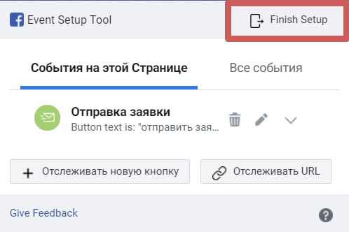 Чтобы сохранить события и закончить их настройку - нажмите на кнопку «Finish Setup» на панели управления.