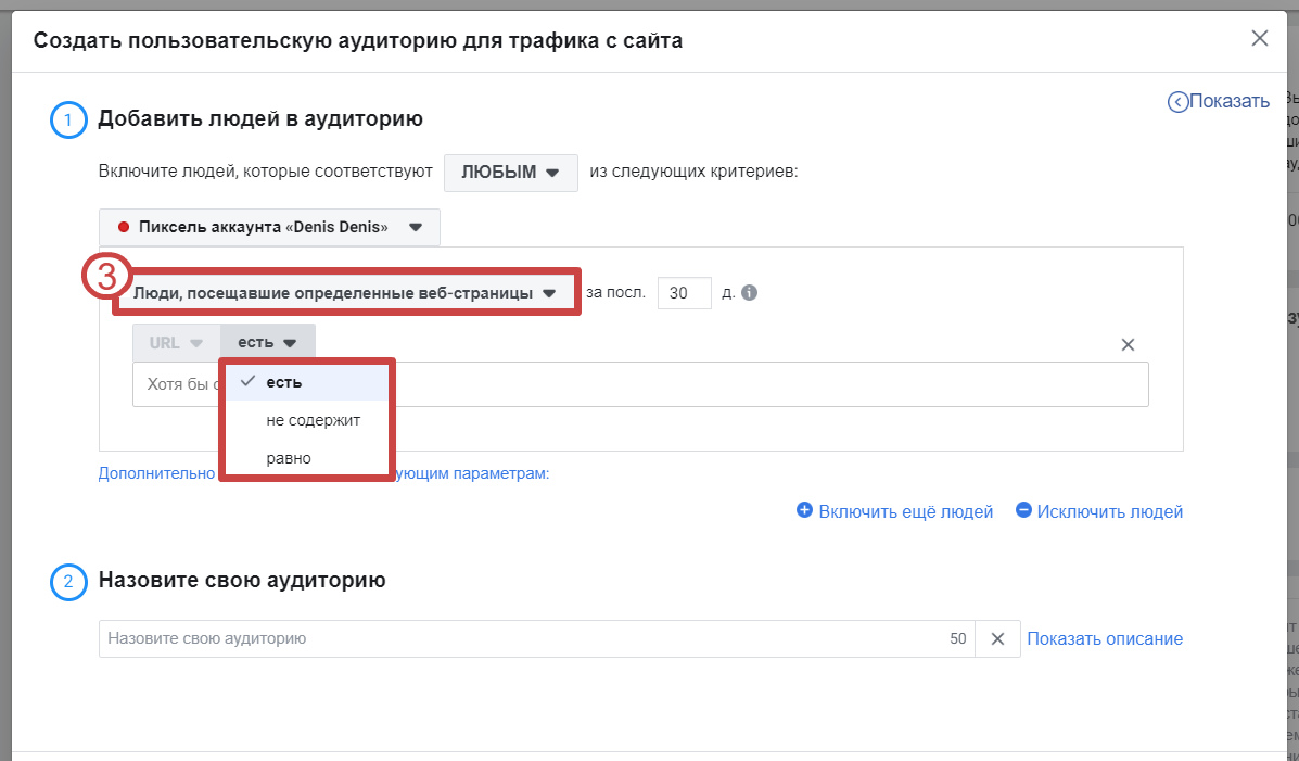 Данная настройка включает или исключает людей, которые ранее посетили определенные страницы за определенный период (до 180 дней):