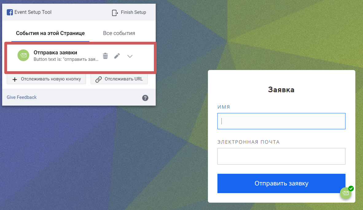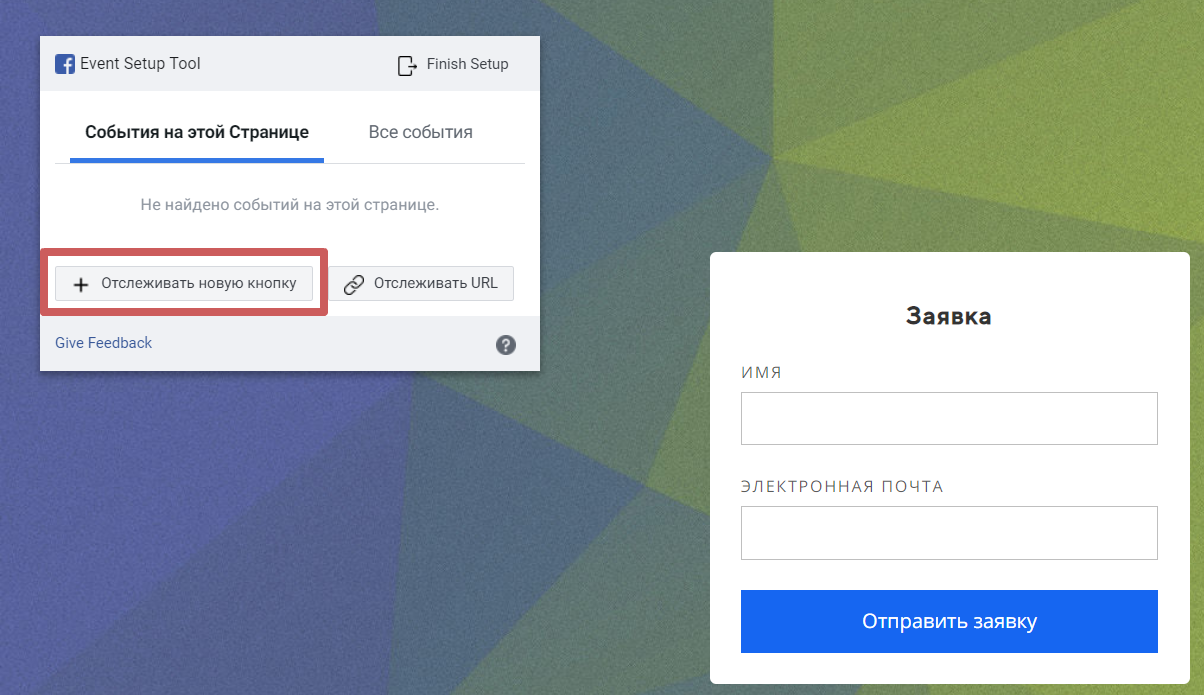 Откроется ваша страница и панель управления событиями. Нажмите на кнопку «Отслеживать новую кнопку»