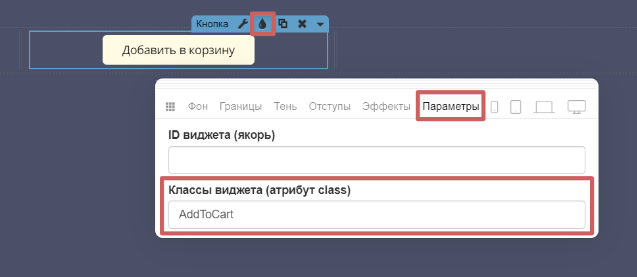 Для этого нужно перейти в настройки стиля кнопки, на вкладку Параметры и указать класс AddToCart :