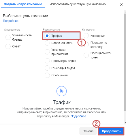 Шаг 2. Для примера выберем цель «Трафик » и перейдем к следующему шагу, нажав на кнопку «Продолжить »