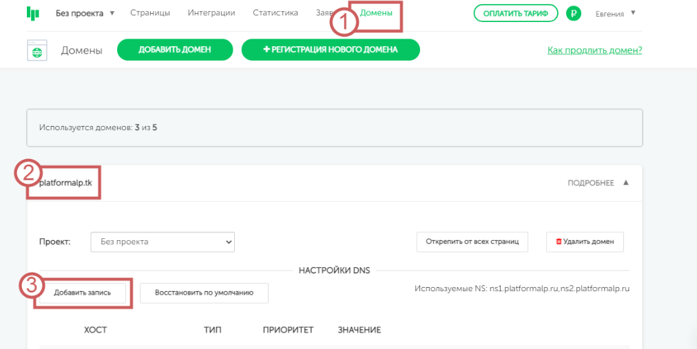 Далее переходим в личный кабинет Платформы LP в раздел «Домены » и в панели управления доменом нажимаем на кнопку «Добавить запись ».