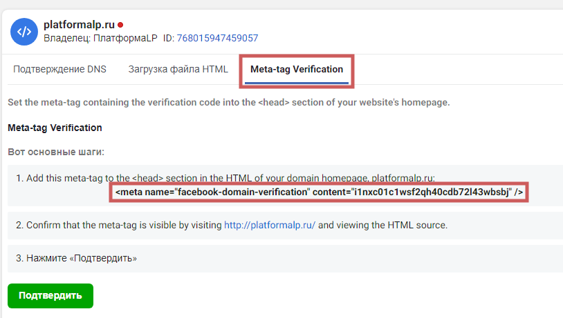 ID: 4933504 URL: https://intercom.help/platformalp/ru/articles/4933504-подтверждение-домена-в-facebook-business Updated: 1707346166