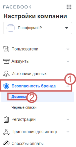 Войдите в бизнес-аккаунт Facebook и перейдите в раздел «Безопасность бренда → Домены »:
