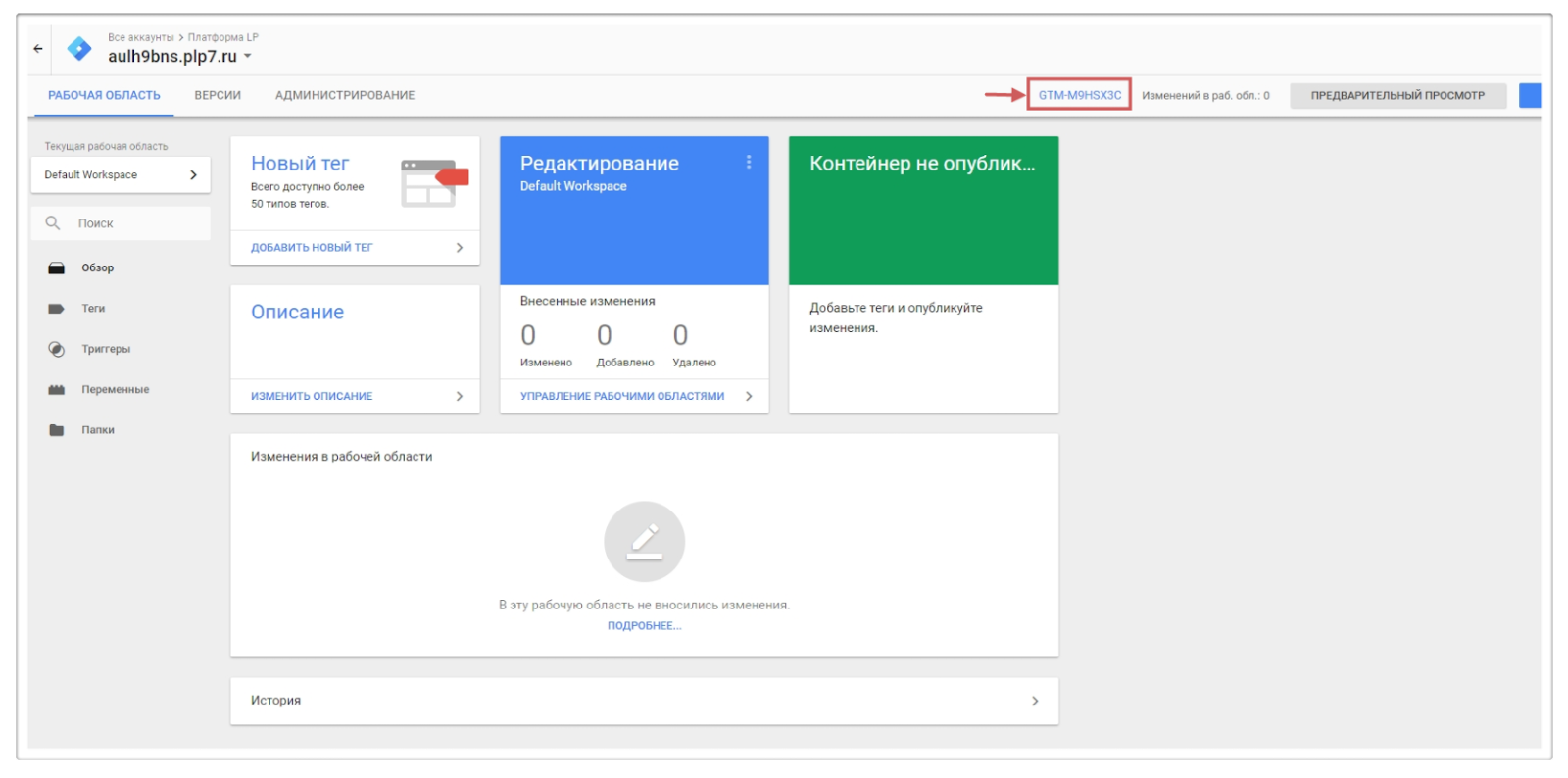 Далее вставляем скопированный код идентификатора в поле “Идентификатор контейнера Google Tag Manager ”.