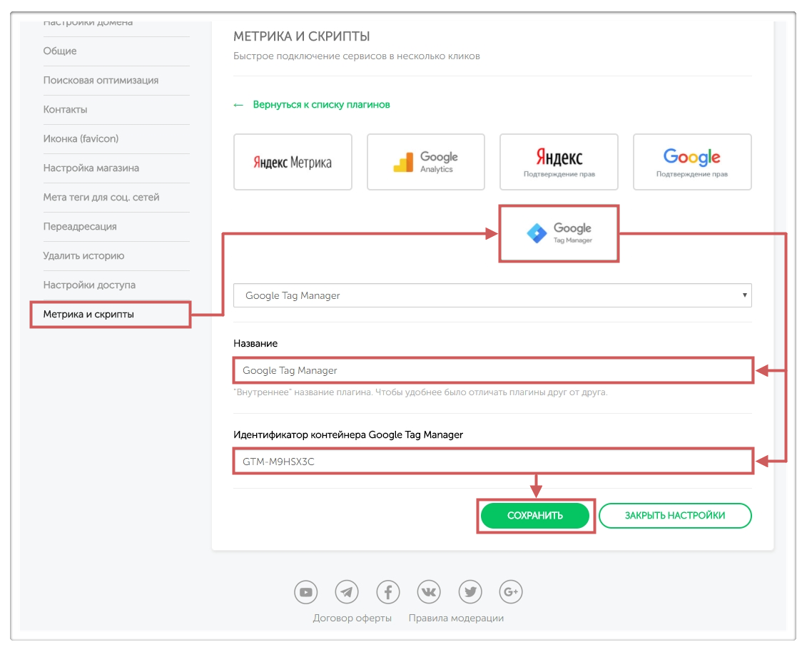 Шаг 7. Открываем вкладку “Метрика и скрипты ” и добавляем новый плагин “Google Tag Manager ”.