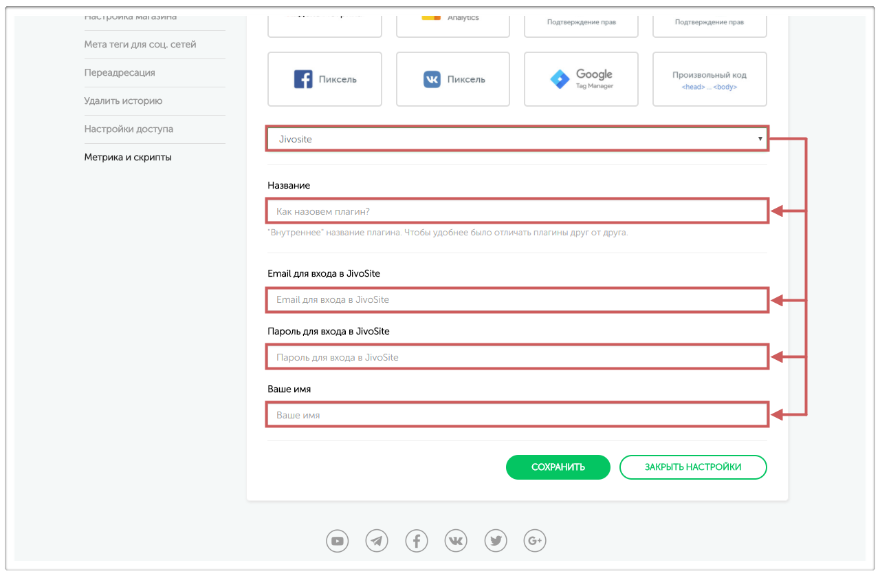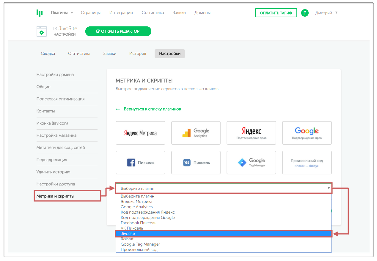 Шаг 2. Во вкладке «Метрика и скрипты» нажмём «Добавить плагин» и выберем в выпадающем списке нужный нам плагин JivoSite.