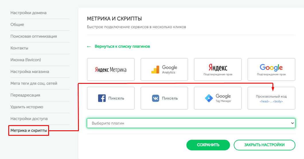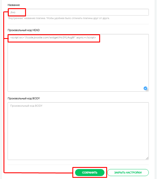 Шаг 4. Пропишем название для плагина, скопированный код вставим в поле HEAD и сохраним изменения