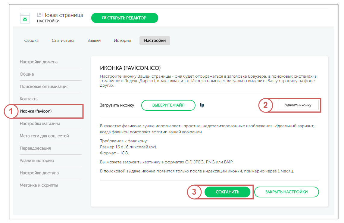 Заходим в настройки страницы, выбираем вкладку «Иконка (favicon)» и нажимаем «Удалить иконку». Затем – «Сохранить».