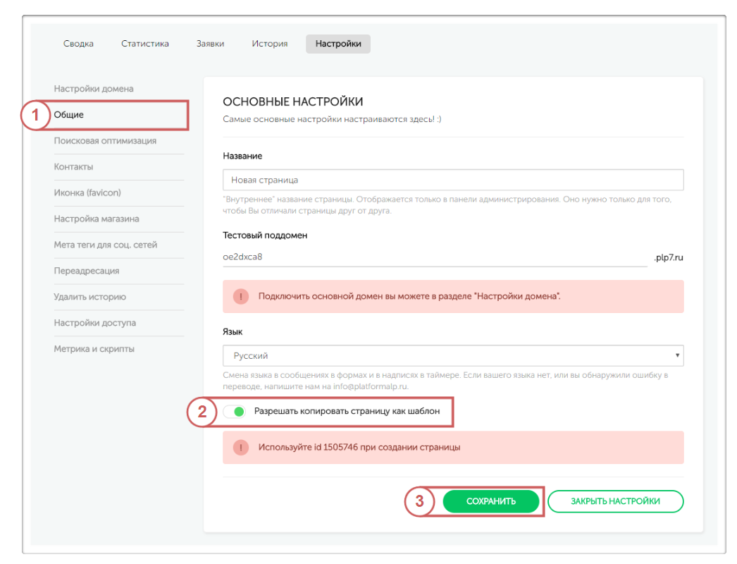 во вкладку “Общие ” и перевести выключатель в левое положение (Выключено), и ваша страница станет недоступна для копирования в качестве шаблона.