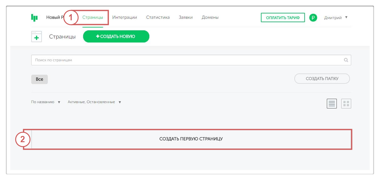 Шаг 1. Нажмём кнопку “Создать первую страницу”.