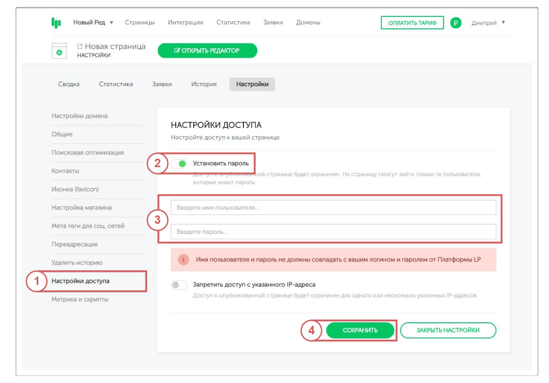 Во вкладке “Настройки доступа ” включим доступ к странице по “Имени пользователя” и “Паролю “.