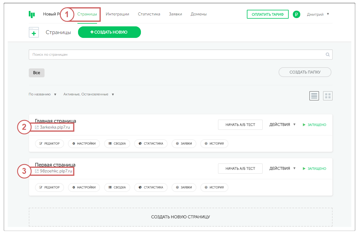 Найти ссылки ваших страниц можно в личном кабинете под названиями страниц.
