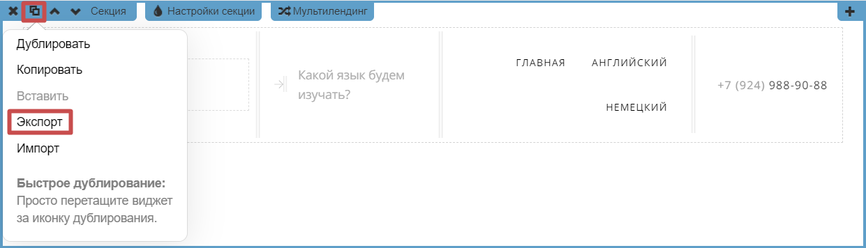 Для этого переходим в «Настройки секции » и нажимаем «Экспорт », кликаем по кнопке «Копировать » в появившемся окне.