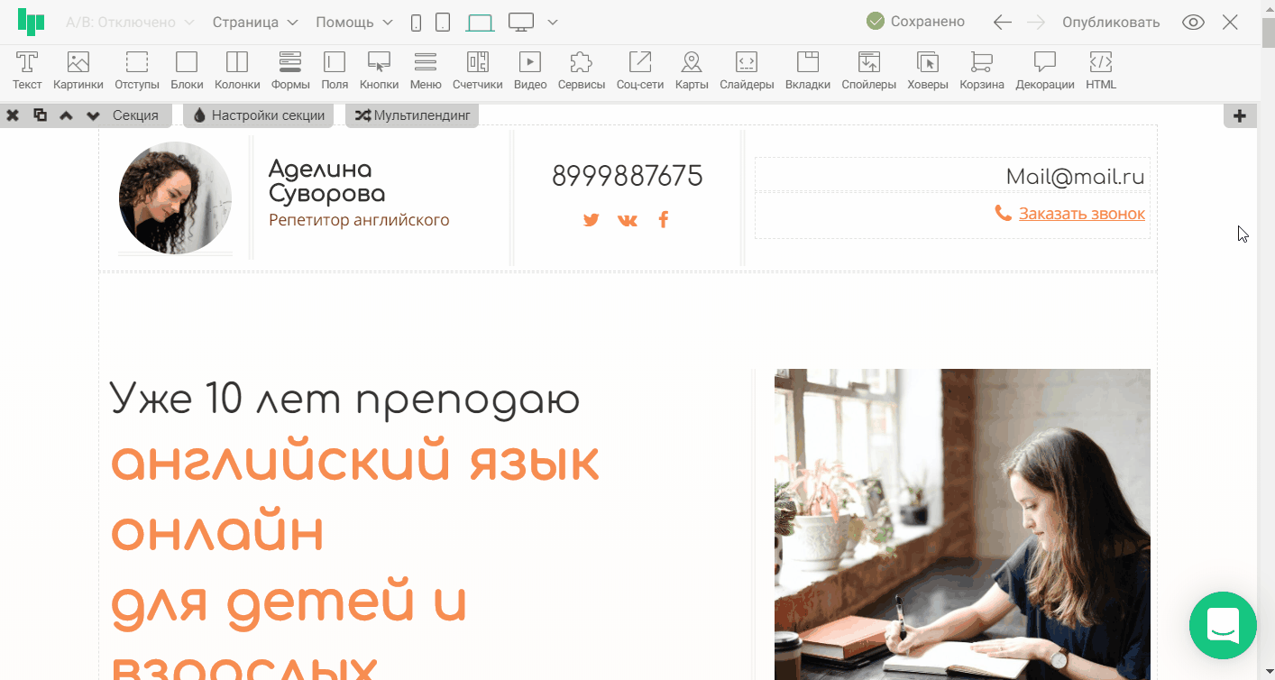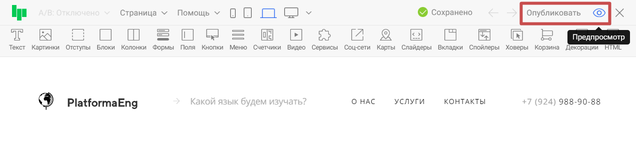 Шаг 7. Переходим в «Предпросмотр » или публикуем страницу для сохранения изменений в редакторе.