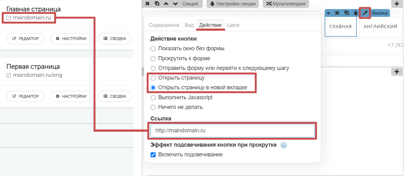Перейдем во вкладку «Действие », выберем «Открыть страницу в новой вкладке » (можно выбрать просто «Открыть страницу ») и в поле «Ссылка » укажем ссылку на «Главную страницу »;