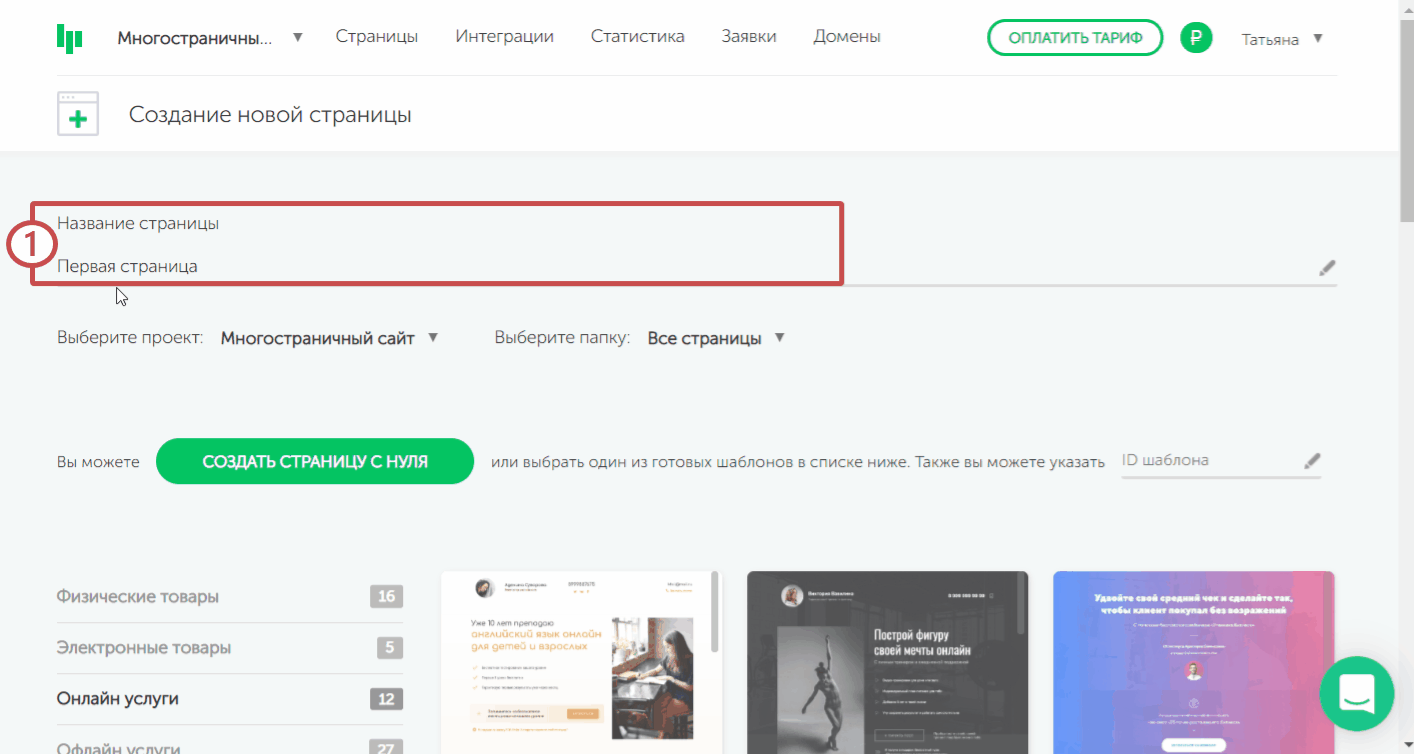 Шаг 5. Выходим из редактора в личный кабинет кликом по крестику в правом верхнем углу редактора. Повторим шаги 1-4 уже для следующей страницы. На этот раз выберем шаблон и укажем название, например, «Первая страница »
