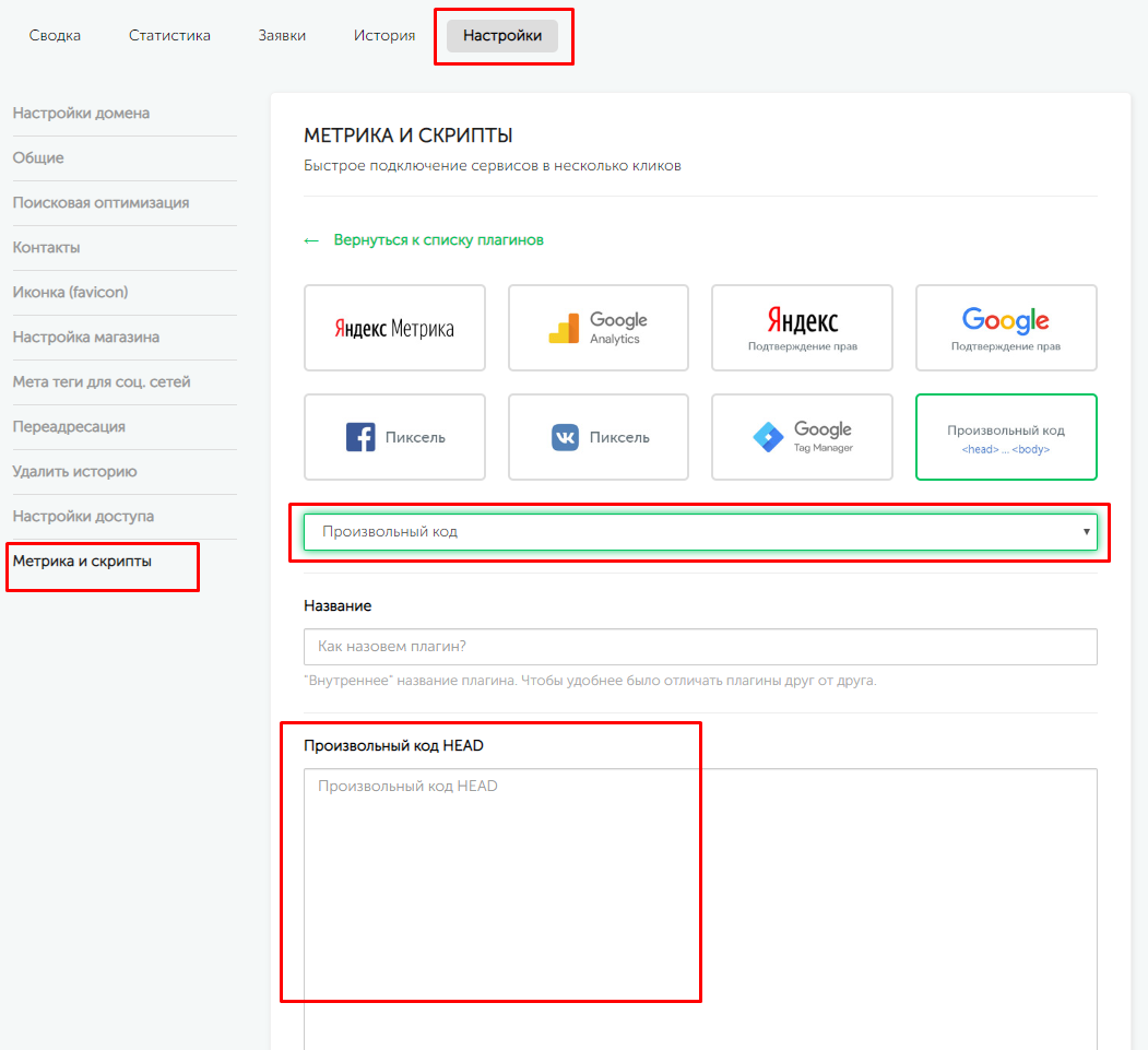Оба скрипта устанавливаются в настройках страницы, раздел «Метрика и скрипты» - Добавить Плагин - Произвольный код - Произвольный код HEAD