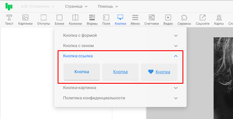 Так же видео можно не размещать на странице, а сделать в виде картинки с ссылкой на само видео на стороннем сервисе (например, Youtube). Для этого используйте «Кнопку-ссылку»: