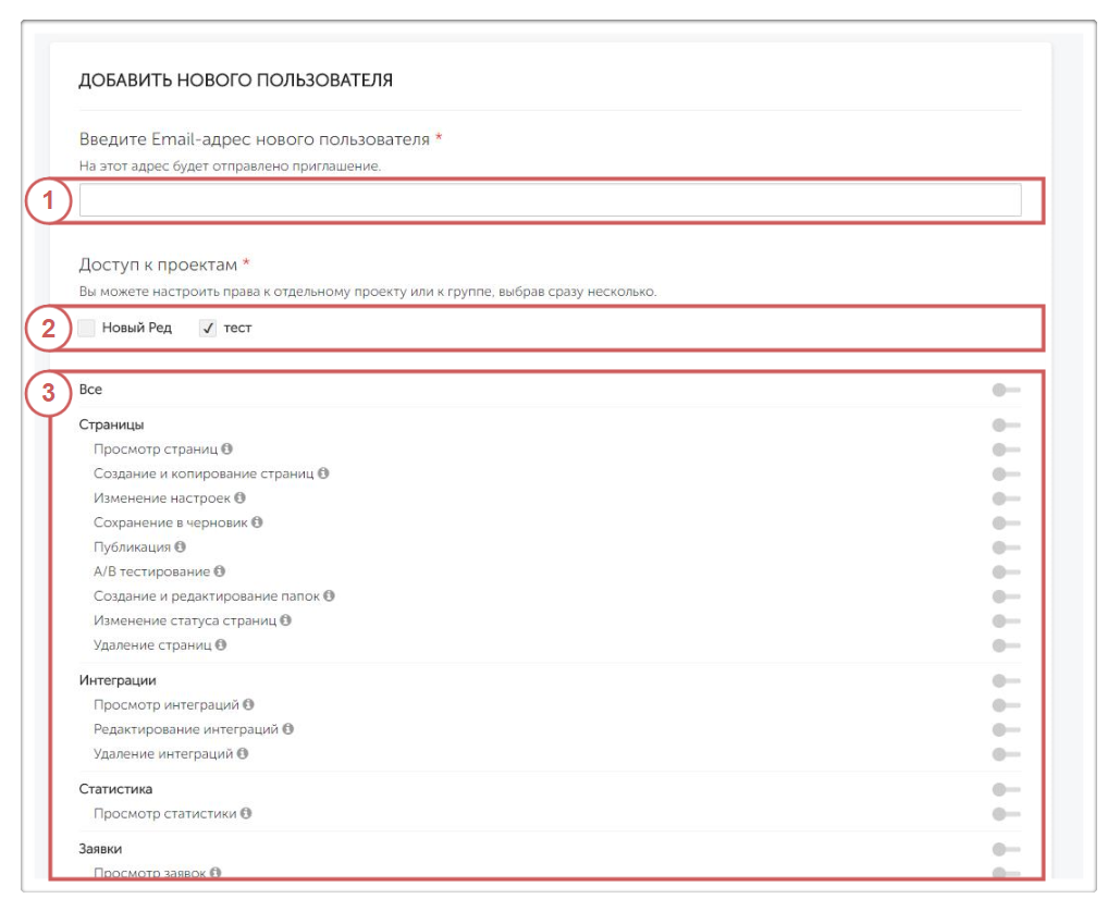 Например, можем создать пользователя с доступом только к редактору или только к просмотру заявок, разрешать ему проводить А/B тестирование либо нет и многое другое – по своему усмотрению.