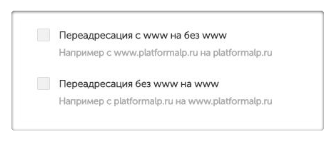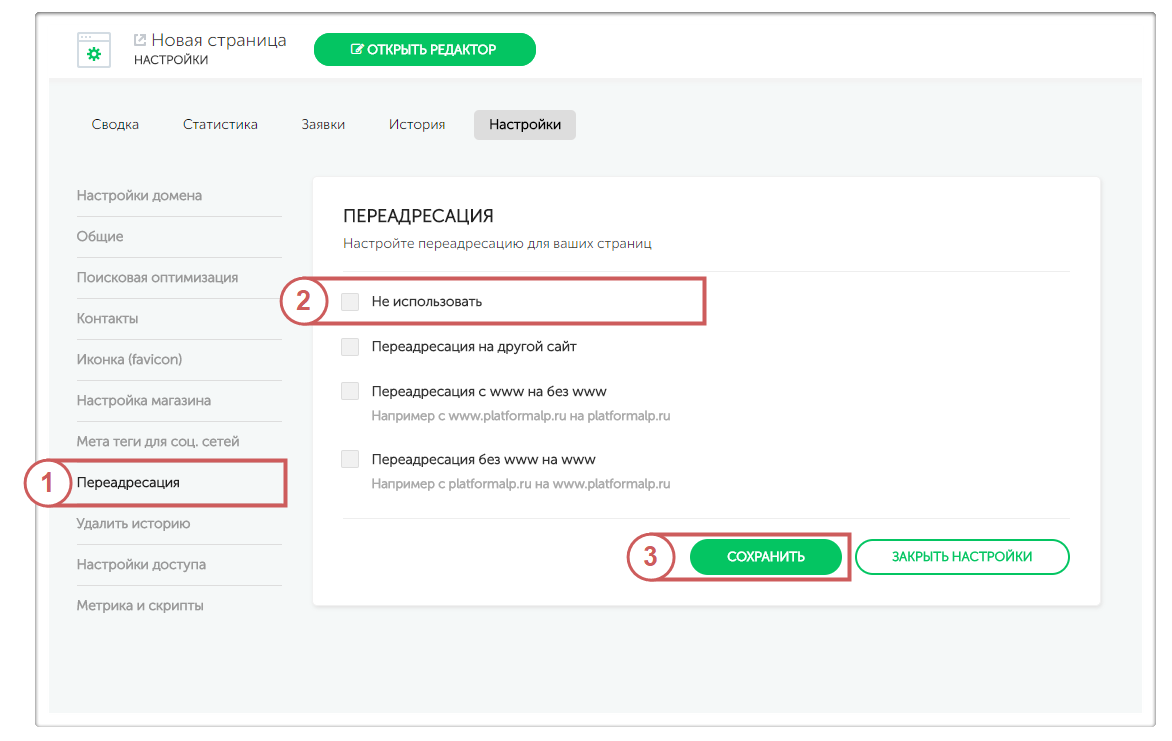 Важно! Для страниц без собственного домена (которые располагаются на бесплатных тестовый поддоменах платформы) доступны только 2 варианта переадресации: