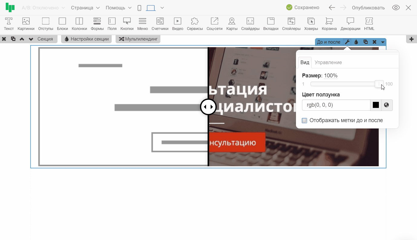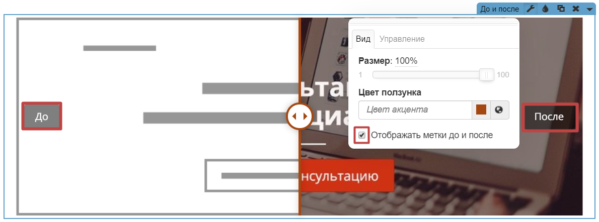 При использовании виджета «До и После» в слайдерах или вкладках для корректной работы виджета обязательно должна быть включена «Ленивая загрузка» на странице. Подробнее о том, что такое «Ленивая загрузка» можно узнать в статье.