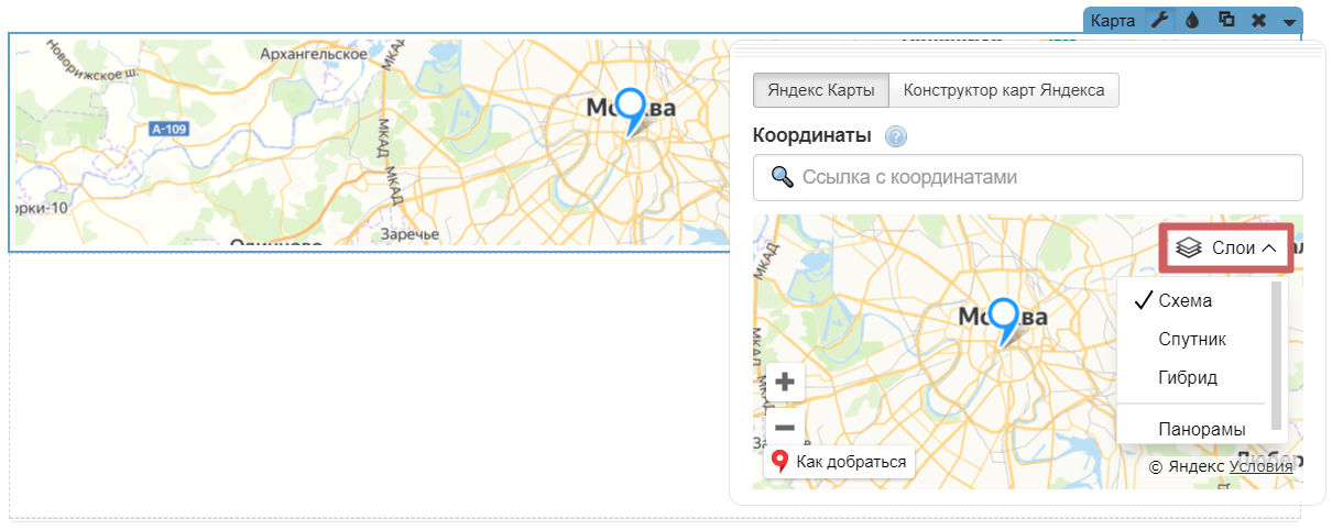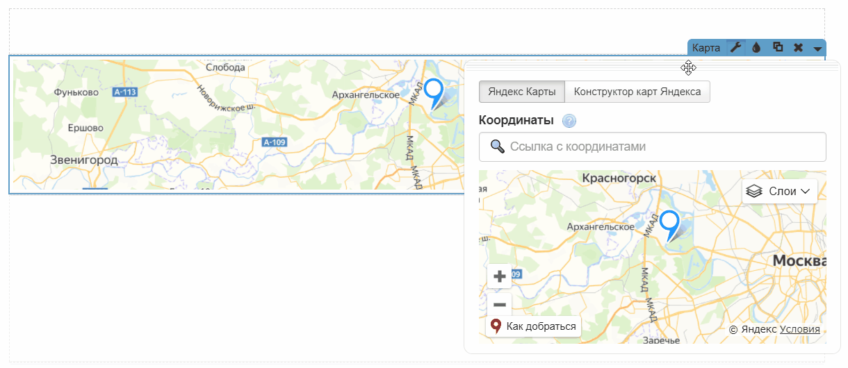 ❗Обратите внимание, что с помощью стандартных возможностей на страницу можно добавить только карту от сервиса Яндекс. Если ваши посетители будут с Украины, то у них карта работать не будет, поскольку на данный момент в Украине сервисы от Яндекс блокируются. Вместо Яндекс.Карты, можно также подключить Google карты с помощью встраивания кода по нашей инструкции: