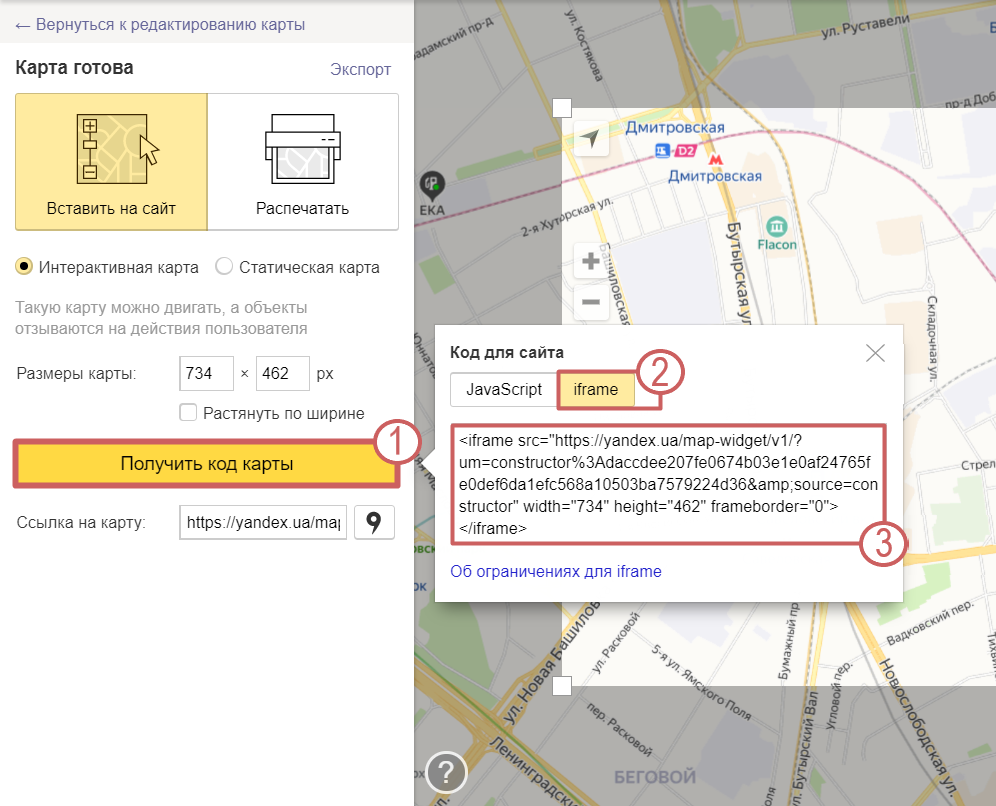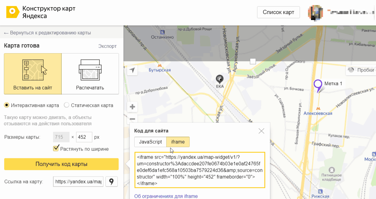 Итак, мы получили код iframe и переходим во вторую вкладку настроек - «Конструктор карт Яндекса ».