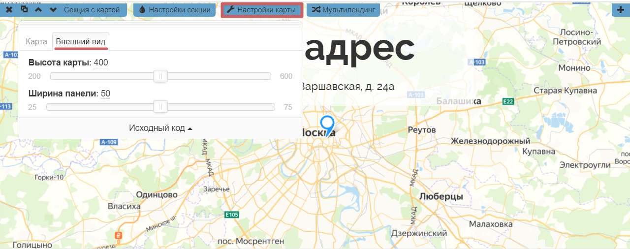 Данная секция отличается разделом «Внешний вид», в котором можно задать отдельно высоту карты и ширину белого блока.