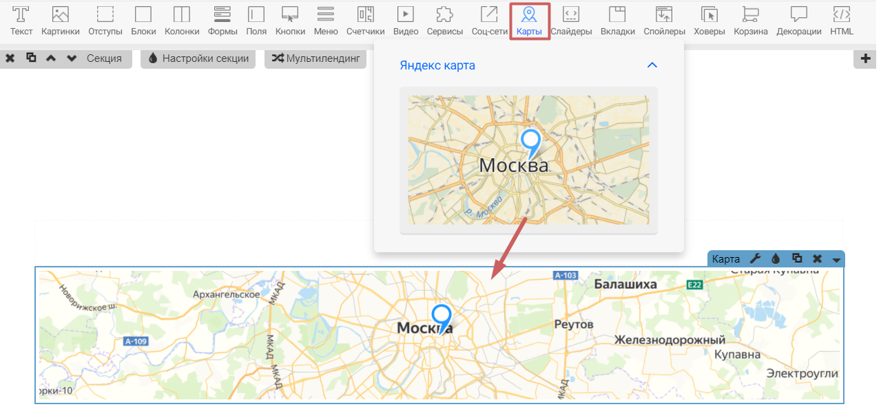 Секцию «Карта» можно найти в готовых секциях, в типе «Контакты»