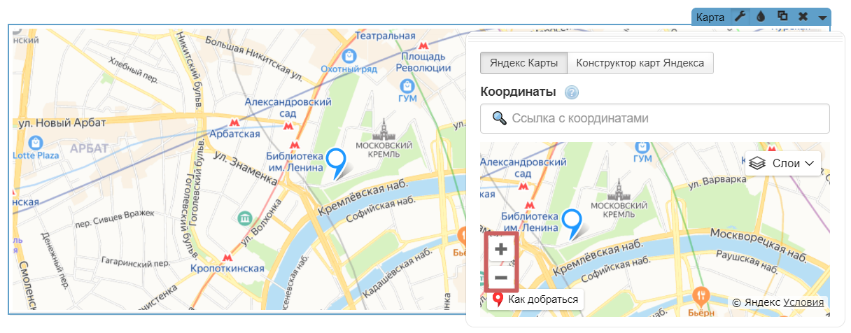 - Иконки плюс и минус. Нажав на эти кнопки, мы можем приблизить или отдалить карту. Положение зафиксируется для опубликованной страницы.