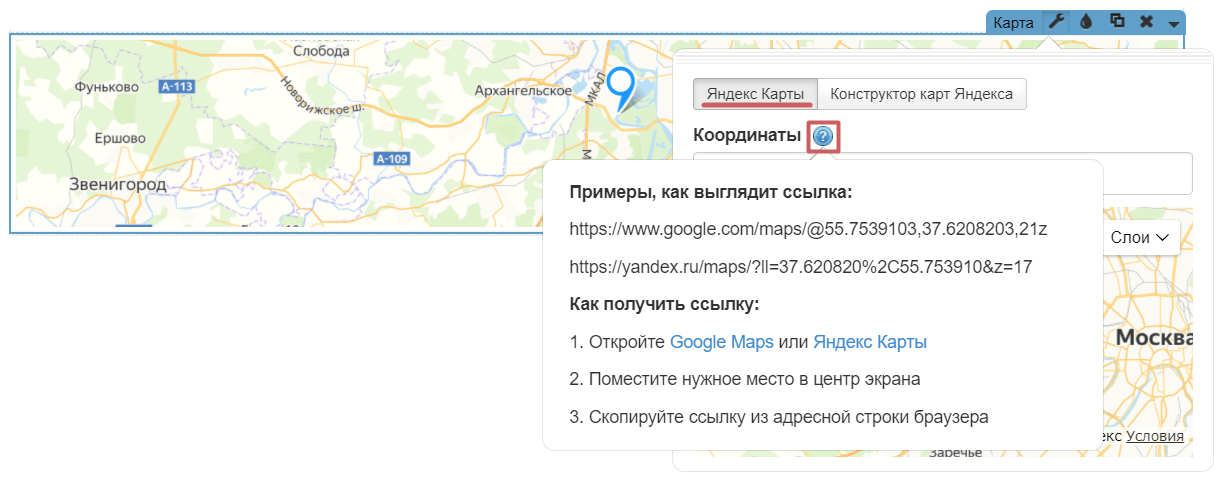 - Координаты - точное местоположение метки на карте. Получаем их выполняя шаги в подсказке.